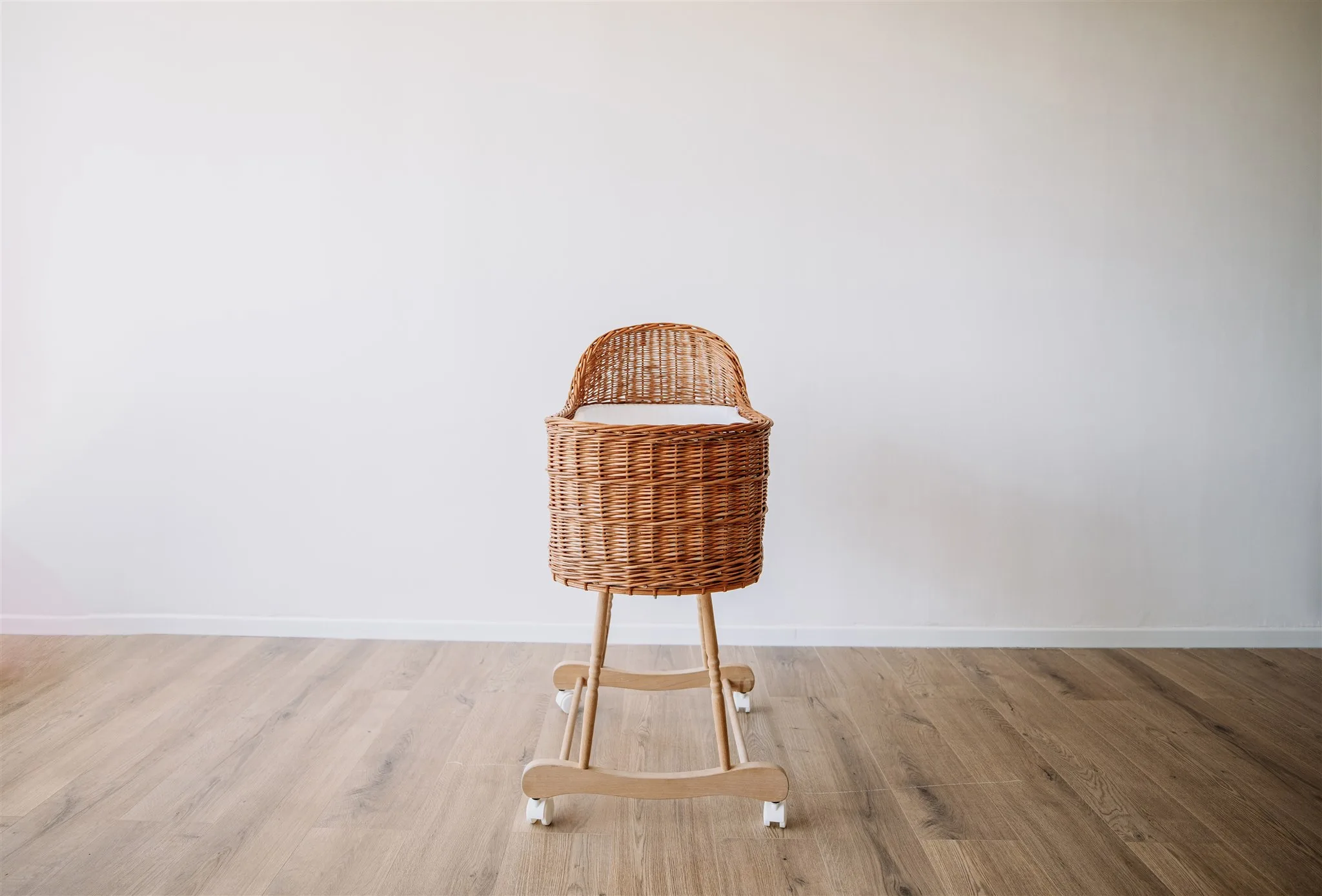 העריסה קלועה מענפי ערבה (salix) 100% טבעיים המיובאים מצרפת. ללא לכה וללא ריחות לוואי. רגלי העריסה עשויות עץ בוק מלא צבוע בצבע מים.