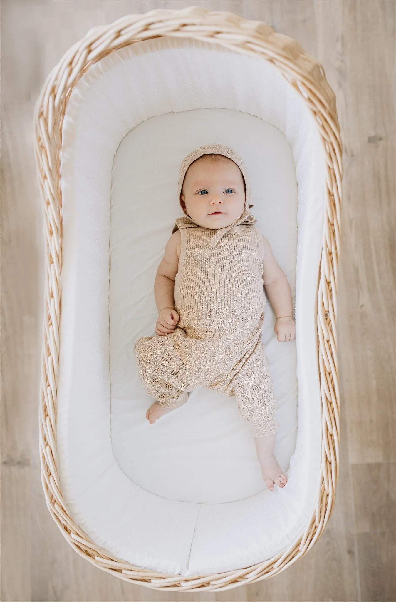 העריסה קלועה מענפי ערבה 100% טבעיים המיובאים מצרפת. ללא לכה וללא ריחות לוואי. רגלי העריסה עשויות עץ בוק מלא צבוע בצבע מים.