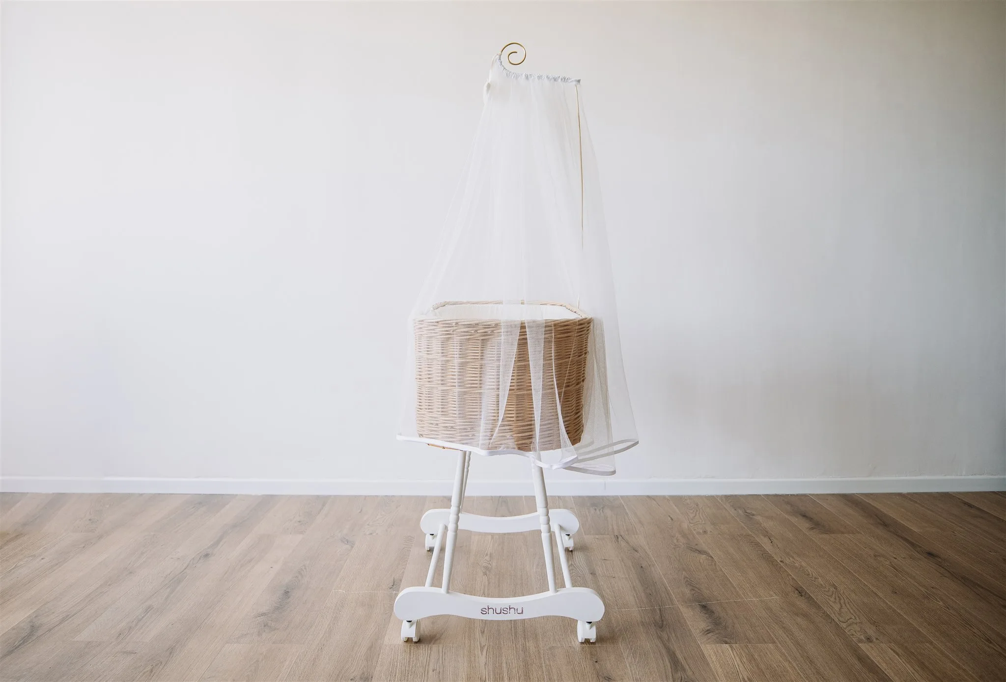 • עריסה קלועה בעבודת יד, שעוברת תהליך חיטוי יסודי ומגיעה מצוחצחת ומוכנה לשימוש.